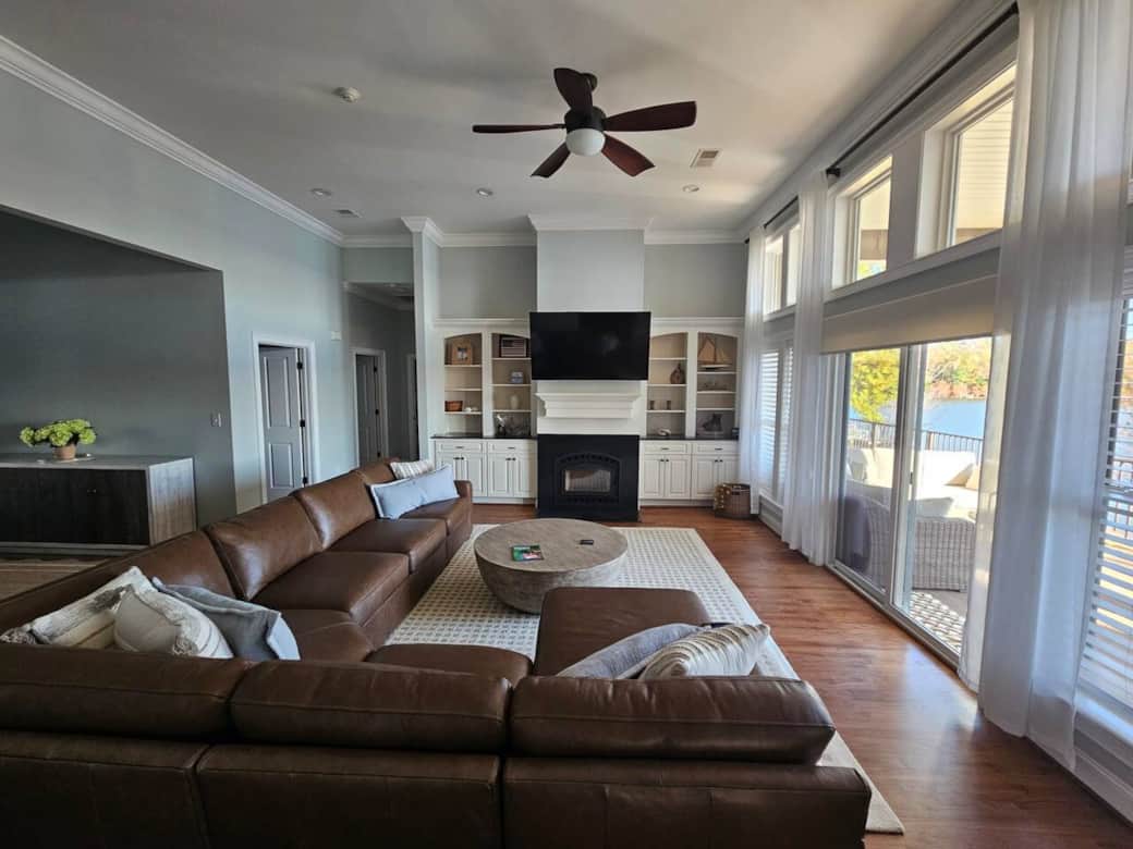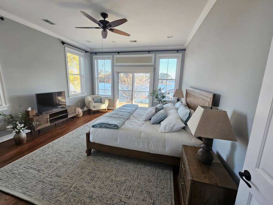 Step inside to an open, light-filled living area where floor-to-ceiling windows frame the sparkling waters of Lake Murray. The beautifully furnished great room invites you to unwind with cozy seating, a large smart TV, and easy access to the expansive deck overlooking the lake.