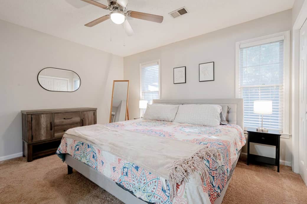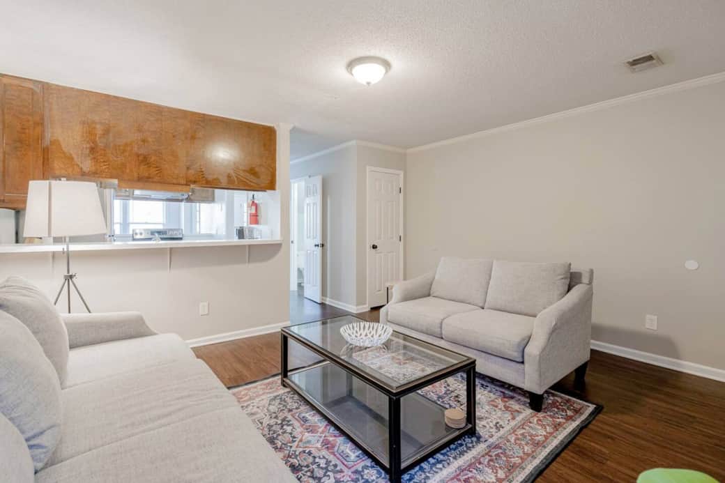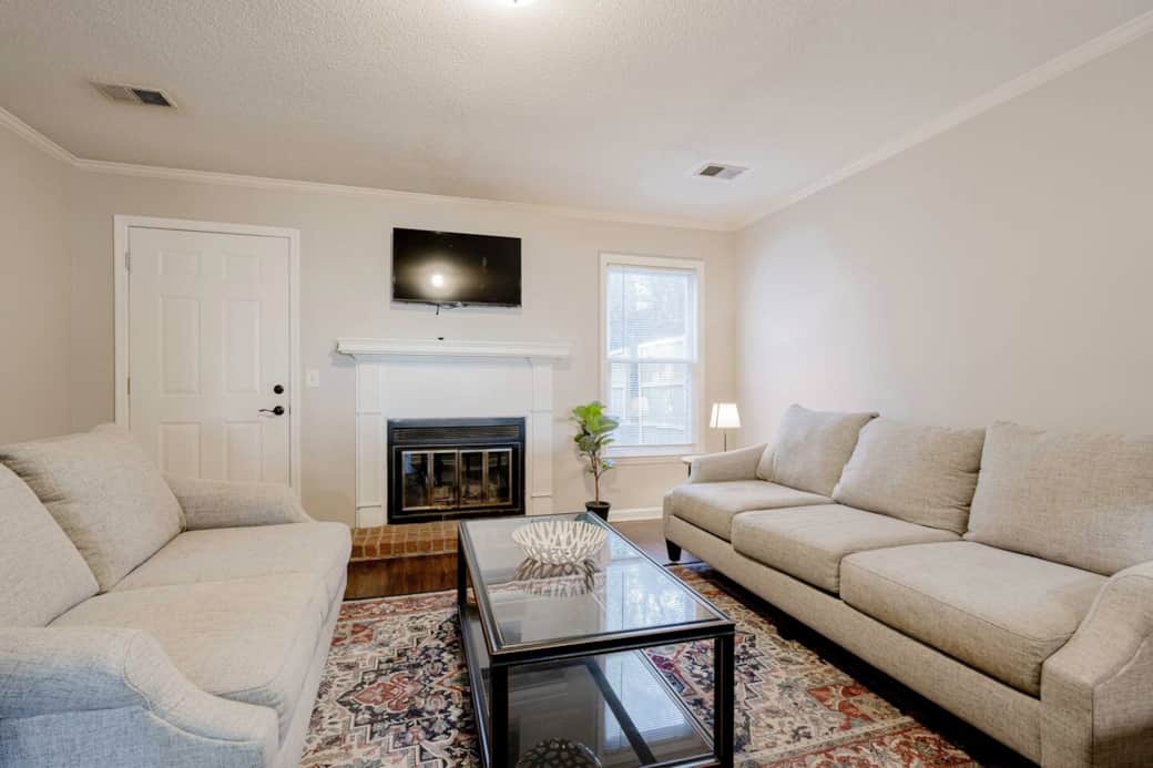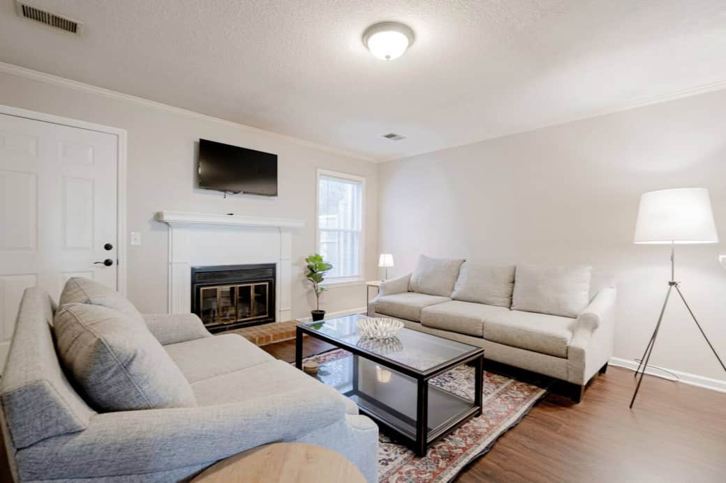 Enjoy a stylish experience at this centrally-located Rosewood Townhouse just minutes from USC, Downtown, Fort Jackson,Prisma Baptist and more. Living room with cosmetic fireplace. Kitchen features a fridge, stove, dishwasher, and bar seating. Half bathroom located downstairs for comfort. Upstairs features carpet and two roomy bedrooms with ample closet space and private bathrooms. washer and dryer included. Backdoor patio. Govt. ID required prior to getting check in code.
